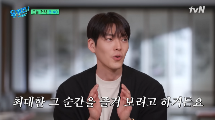 김우빈은 “저는 제가 잠깐 공백기를 가지면서 너무 미래에만 살았던 제가 좀 속상하더라. 그게 좀 슬펐다. 물론 그 순간순간을 즐기기도 했지만 더 온전히 즐겼으면 더 좋았을 텐데라는 생각이 들었다. 그랬던 시간들이 참 아쉬워서 요즘에는 최대한 그 순간을 즐겨보려고 한다. 작은 것부터 실천하는 데 예를 들면 나랑 대화하는 사람 눈을 좀 더 본다든지 이 사람이 뭘 입고 있는지 관찰해 보고. 그런 시간들을 가지니까 되게 후회가 많이 없는 것 같더라. 되게 잘 지낸 것 같은 느낌, 하루를”이라고 말했다.