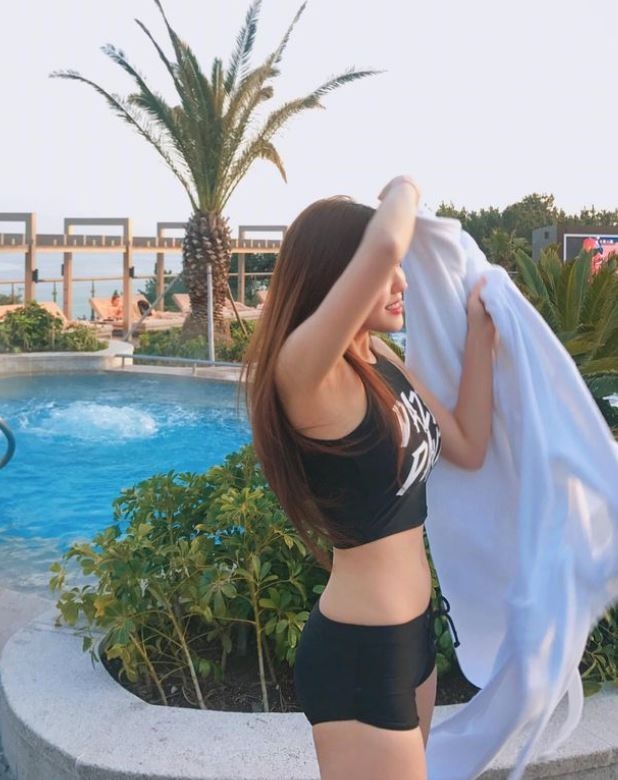 효민은 루프탑 야외 풀에서 여러 각도로 사진을 찍었다. 그는 검은색 브라톱 수영복을 입고 포즈를 취하고 있다. 탄탄한 복근과 잘록한 허리, 늘씬한 각선미가 돋보인다.