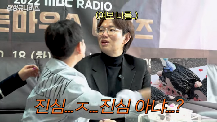 막방을 끝내고 대기실로 간 장성규는 아내의 깜짝 방문과 커스텀 케이크에 놀랐다.
