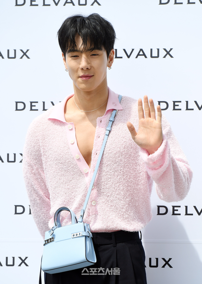 몬스타엑스 셔누가 12일 서울 강남구 갤러리아에서 진행된 럭셔리 가죽 브랜드 델보(DELVAUX) 압구정점 리뉴얼 오픈기념 포토콜 행사에서 취재진을 향해 포즈를 취하고 있다. 2023. 5. 12.