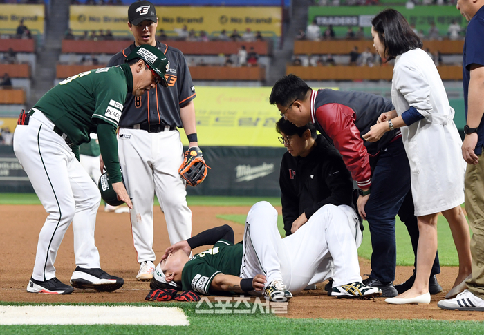 SSG 랜더스 추신수가 12일 인천 SSG 랜더스필드에서 열린 2023 KBO리그 한화 이글스와 경기 7회말 1사 1-2루 최주환의 2루타 때 1루에서 3루까지 뛰는 과정에서 베이스를 밟다 발목 부상을 당해 그라운드에 쓰러져있다. 2023. 5. 12.