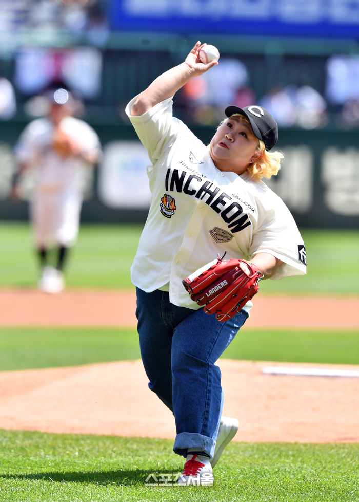 개그맨 홍윤화 김민기 부부가 14일 인천SSG랜더스필드에서 열린 2023 프로야구 SSG랜더스와 한화이글스의 주말 3연전 일요일 경기에서 시구를 하고 있다. 홍윤화를 업으려던 남편 김민기가 결국 홍윤화에 업혀 퇴장하고 있다. 2023.05.14.