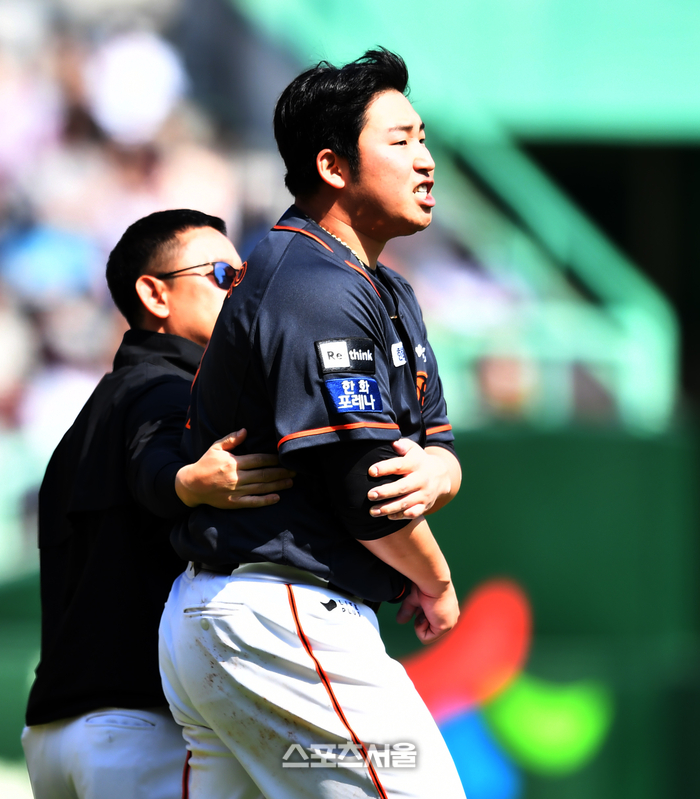 한화 김민우가 14일 인천SSG랜더스필드에서 열린 2023 프로야구 SSG랜더스와 한화이글스의 주말 3연전 일요일 경기 4회말 SSG 4번타자 에레디아의 타구에 팔꿈치를 맞은 후 고통스러워하고 있다. 김민우는 바로 교체됐다. 2023.05.14.