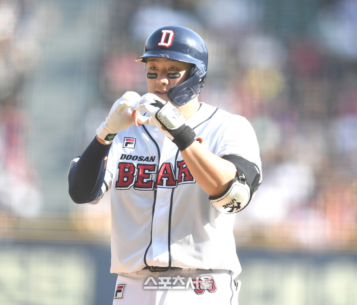 두산 양석환이 14일 잠실야구장에서 열린 2023 KBO리그 KIA와 경기 7회말 우중간 안타를 친 후 세리머니를 하고 있다. 2023. 5. 14. 잠실 | 최승섭기자 thunder@sportsseoul.com