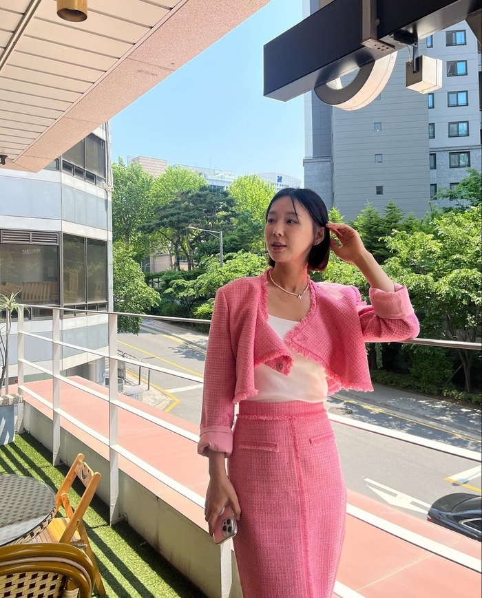 공개한 사진에는 분홍색 정장을 입은 이지혜가 늦봄을 만끽하는 모습이 담겼다.