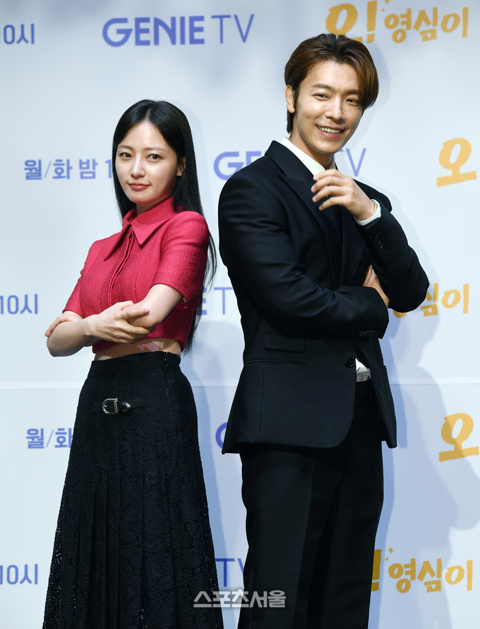 배우 송하윤(왼쪽)과 이동해가 15일 서울 라마다서울신도림호텔에서 진행된 지니 TV 오리지널 ‘오! 영심이’ 제작발표회에서 취재진을 향해 포즈를 취하고 있다.