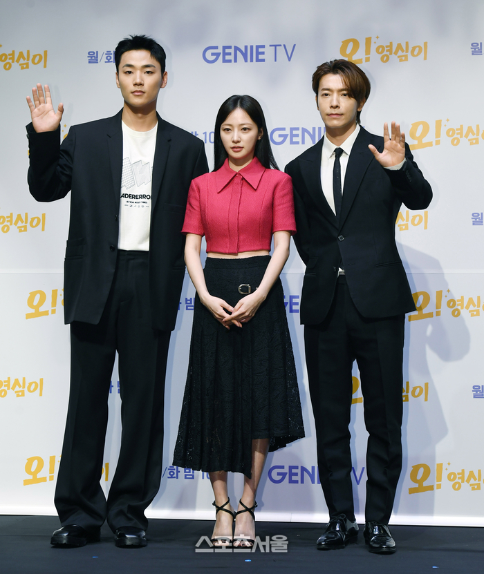 배우 이민재(왼쪽)와 송하윤(가운데), 이동해가 15일 서울 라마다서울신도림호텔에서 진행된 지니 TV 오리지널 ‘오! 영심이’ 제작발표회에서 취재진을 향해 포즈를 취하고 있다.