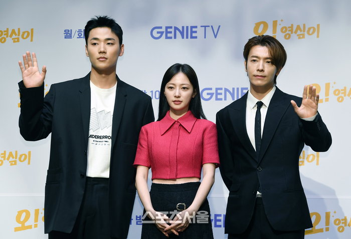 배우 이민재(왼쪽)와 송하윤(가운데), 이동해가 15일 서울 라마다서울신도림호텔에서 진행된 지니 TV 오리지널 ‘오! 영심이’ 제작발표회에서 취재진을 향해 포즈를 취하고 있다.