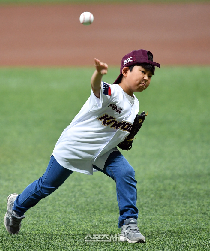 키움팬 정서준 군이 16일 고척스카이돔에서 열린 2023 프로야구 키움히어로즈와 두산베어스의 경기에서 시구를 하고 있다.