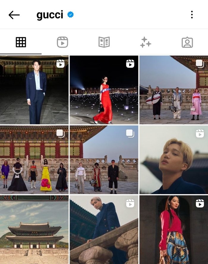 구찌의 소셜미디어에서 해당 내용은 찾아볼 수 없다. 여전히 경복궁을 배경으로, 수많은 배우와 모델들이 찍힌 사진만을 볼 수 있다.