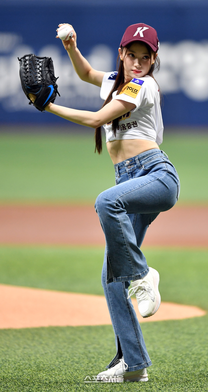 9인조 걸그룹 케플러(Kep1er) 샤오팅이 17일 고척스카이돔에서 열린 2023 프로야구 키움히어로즈와 두산베어스의 경기에 앞서 시구를 하고 있다. 2023.05.17.