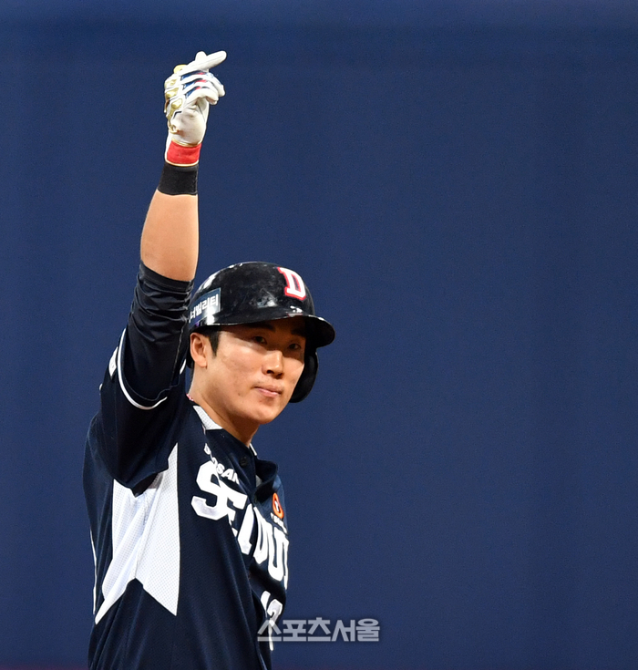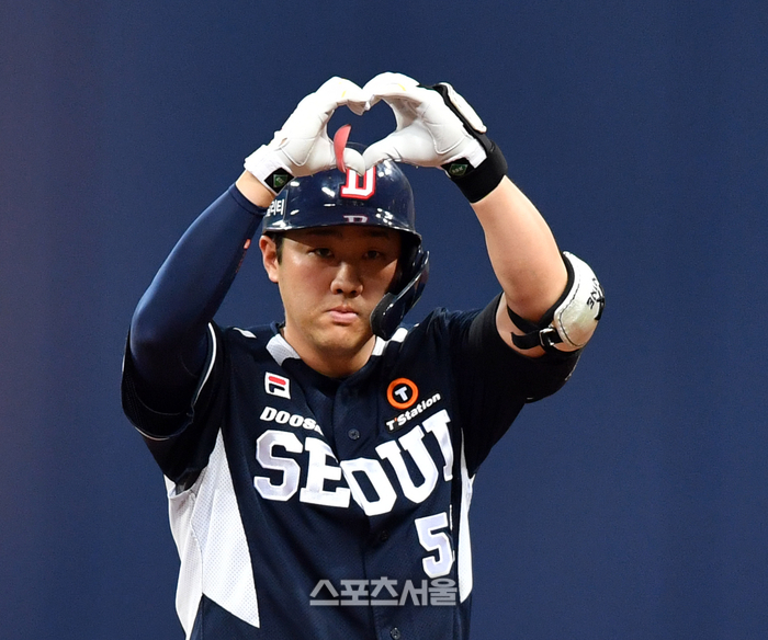 [스포츠서울 | 고척=장강훈기자] 두산 타선에 ‘사랑’이 넘친다 이른바 ‘하트 세리머니’가 경기 초반부터 서울 고척스카이돔을 물들였다.