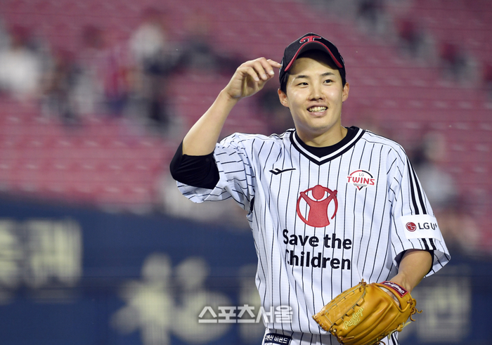 LG 트윈스 선발투수 임찬규가 17일 잠실구장에서 열린 2023 KBO리그 KT 위즈와 경기 5회초 수비까지 2실점으로 승리 투수 요건을 갖추고 덕아웃으로 들어가면서 미소를 짓고 있다. 2023. 5. 17.