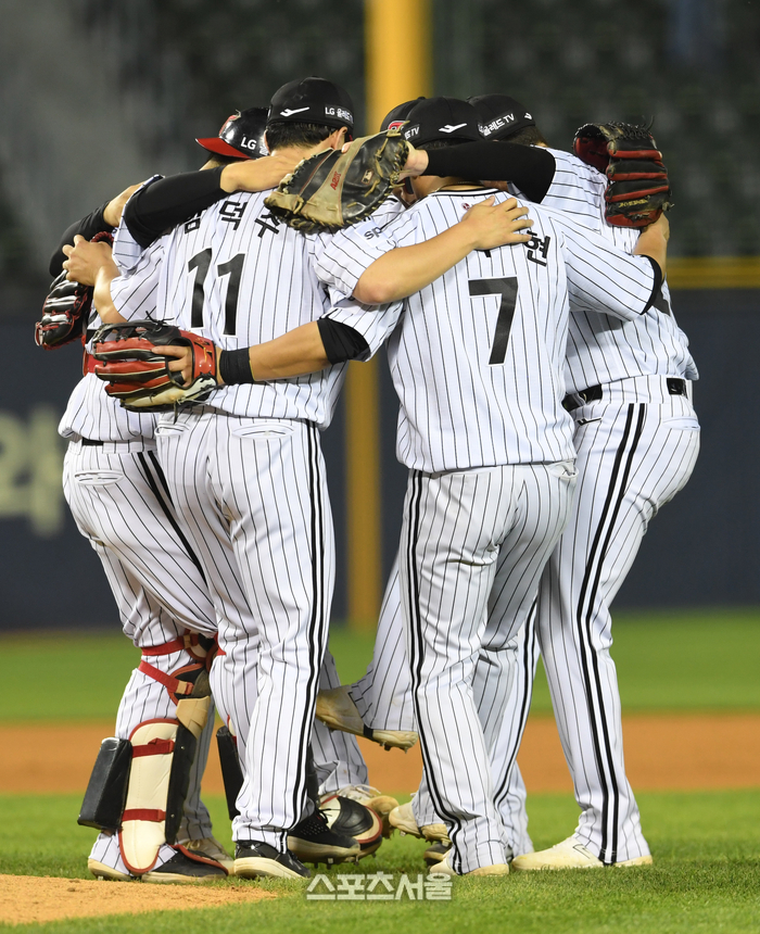 LG 트윈스 선수들이 17일 잠실구장에서 열린 2023 KBO리그 KT 위즈와 경기에서 7-3으로 승리한 뒤 함께 세리머니를 하고 있다. 2023. 5. 17.