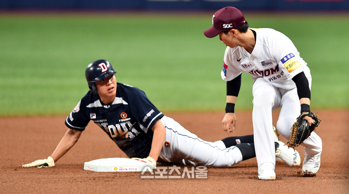 두산 1번 정수빈이 18일 고척스카이돔에서 열린 2023 프로야구 키움히어로즈와 두산베어스의 경기 1회초 1사 1루 3번 양의지 타석때 2루도루에 성공하고 있다. 수비는 김혜성 2023.05.18.