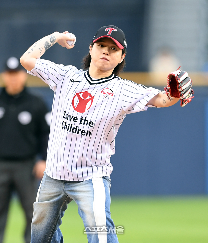 세이브더칠드런의 홍보대사인 래퍼 원슈타인이 18일 잠실구장에서 열린 2023 KBO리그 LG 트윈스와 KT 위즈의 경기에 앞서 시구를 한 뒤 기뻐하고 있다. 2023. 5. 18.