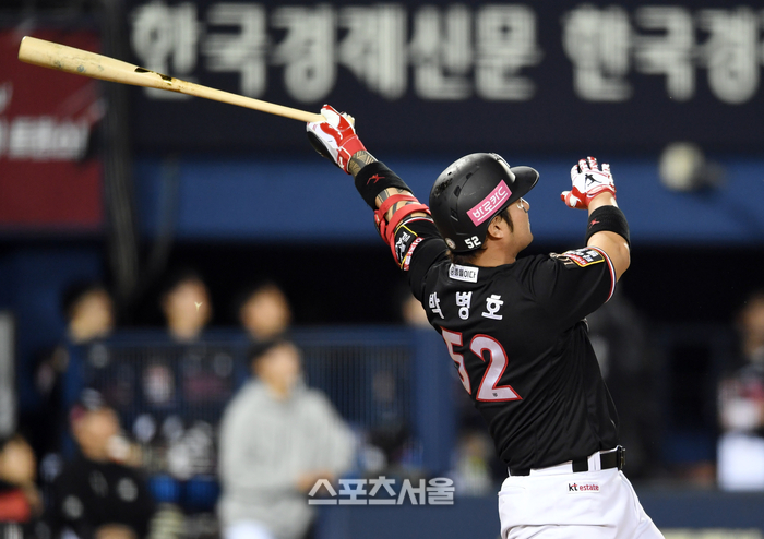 KT 위즈 박병호가 18일 잠실구장에서 열린 2023 KBO리그 LG 트윈스와 경기 9회초 1사 LG 최동환을 상대로 솔로 홈런을 치고 있다. 박병호의 시즌 3호 홈런. 2023. 5. 18.