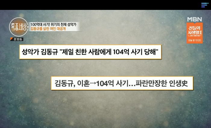 위기는 계속됐다. 이혼 후 김동규는 제일 친한 지인에게 104억 사기 피해를 당했다. 그는 “어떤 지인의 유혹으로 (사기를 당하게) 됐는데 내 돈만 있는 게 아니라 남의 돈도 같이 있었다. 나를 믿고 투자를 했었다. 그래서 더 힘들었다. 남의 돈도 같이 엮여서 들어가서 제가 책임을 지게 되는 상황이 됐다”고 씁쓸해했다.