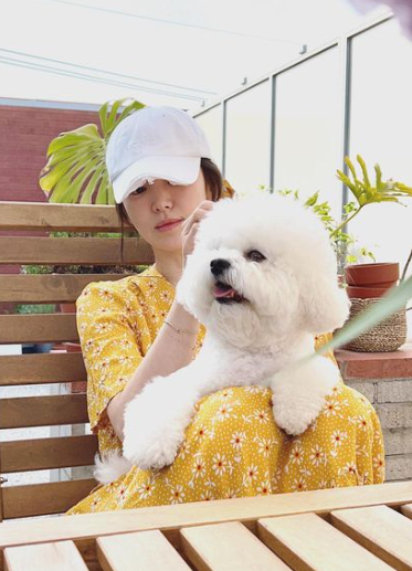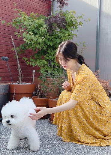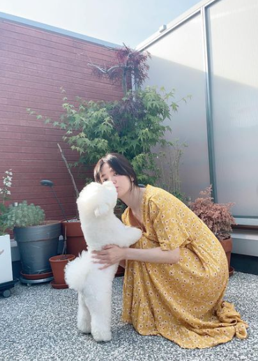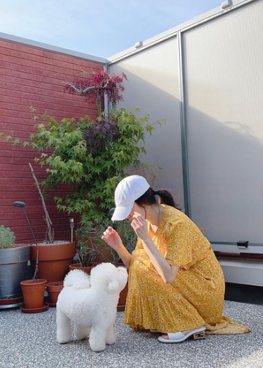 사진에는 송혜교와 그의 반려견 루비가 담겼다. 노란 꽃무늬 프린팅 원피스를 입은 송혜교는 반려견과 즐거운 시간을 보내고 있다.