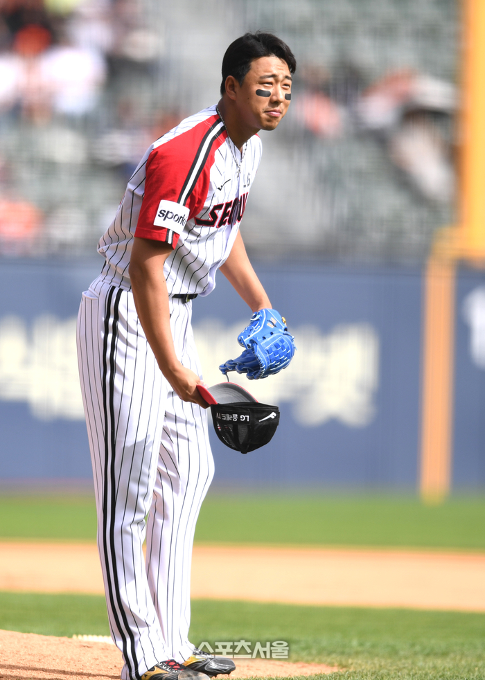 LG 투수 정우영이 21일 잠실야구장에서 열린 2023 KBO리그 한화와 경기 7회초 투구에 맞은 상대 채은성에 사과하고 있다. 2023. 5. 21. 잠실 | 최승섭기자 thunder@sportsseoul.com