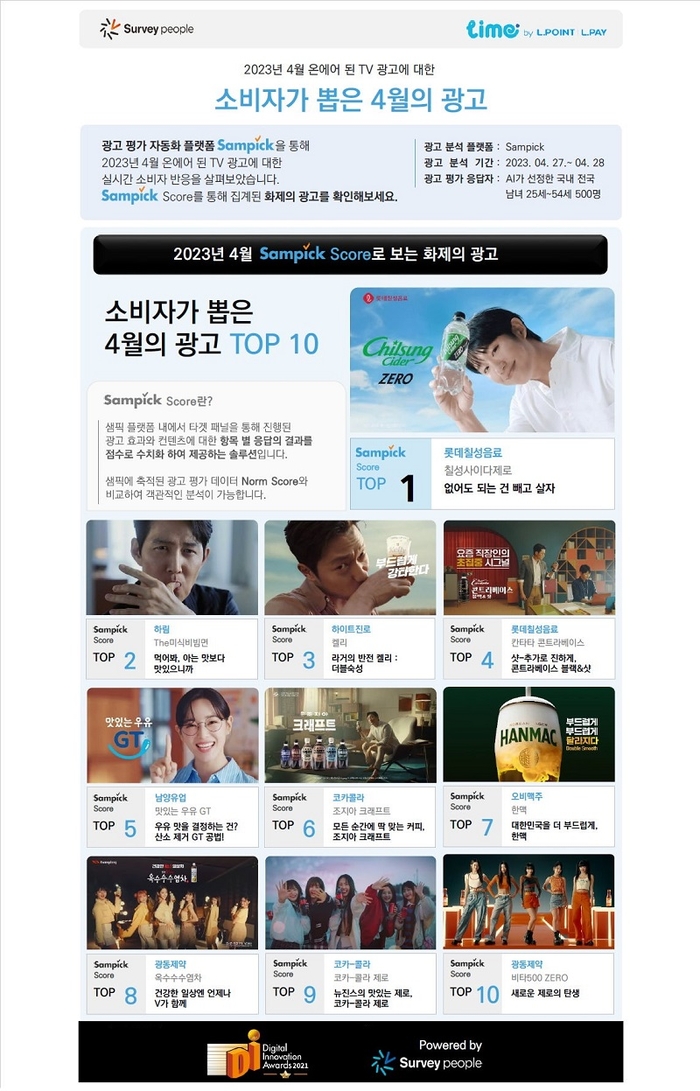 롯데멤버스에 따르면 지난 4월 온에어한 TV광고 중 소비자 평가 1위를 차지한 광고는 칠성사이다제로 ‘없어도 되는 건 빼고 살자’ 편이었다. 광고 효과 및 콘텐츠 평가 항목별 합산 점수가 791.1점으로 가장 높았다. 그 뒤를 더미식 비빔면 ‘먹어봐, 아는 맛보다 맛있으니까’ 편(779.6), 켈리 ‘라거의 반전 켈리: 더블숙성’ 편(776.1), 칸타타 콘트라베이스 ‘샷-추가로 진하게, 콘트라베이스 블랙&샷’ 편(766.1), 맛있는 우유 GT ‘우유 맛을 결정하는 건? 산소 제거 GT공법’ 편(763.9) 등이 차례로 이었다.