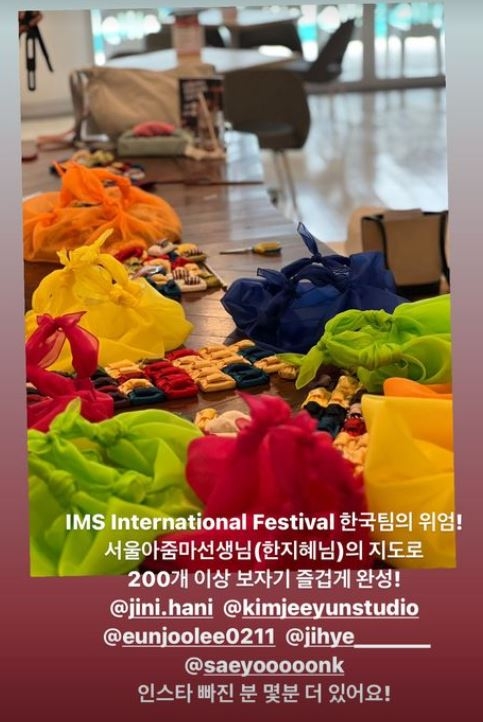 다른 사진에는 알록달록한 보자기들이 테이블 위에 놓여져 있다. 강수정은 “IMS 국제 페스티벌 한국팀의 위엄! 서울아줌마선생님(한지혜 님)의 지도로 200개 이상 보자기 즐겁게 완성”이라는 글과 함께 근황을 전했다.