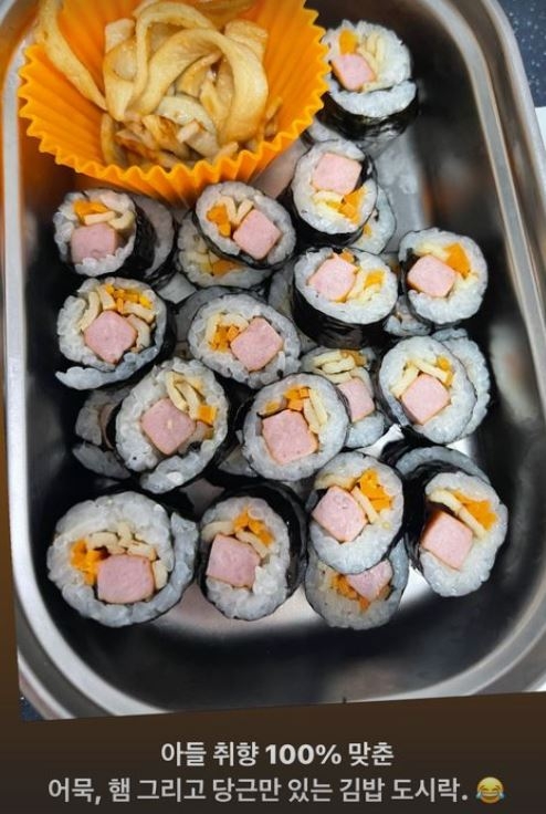22일 강수정은 자신의 채널 스토리에 “아들 취향 100% 맞춘 어묵, 햄 그리고 당근만 있는 김밥 도시락”이라는 글과 함께 사진을 게재했다.