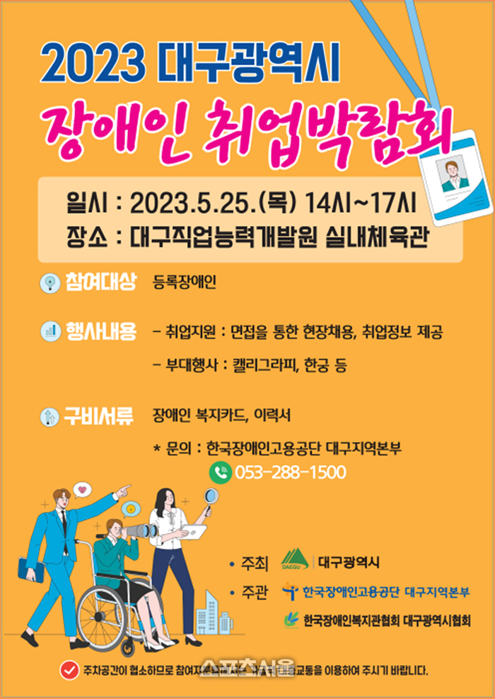 [스포츠서울│대구=김정섭기자] 대구시는 오는 25일 오후 2시부터 오후 5시까지 대구직업능력개발원 실내체육관에서 ‘2023년 대구광역시 장애인 취업박람회’를 개최한다.