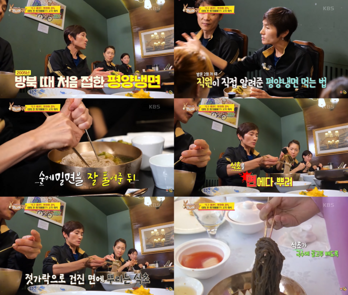 이어 KBS의 방북 당시 옥류관의 직원이 실제 알려주는 법이 이와 같다는 장면이 등장했다. 또, 허재 고양 데이원 점퍼스 대표가 깨알같이 모습을 보여 웃음을 자아냈다.