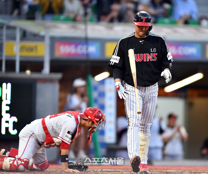 LG 8번타자 이재원이 23일 인천SSG랜더스필드에서 열린 2023 프로야구 SSG랜더스와 LG트윈스의 경기 4회초 2사 만루에서 밀어내기 볼넷으로 출루하고 있다. . 2023.05.23.