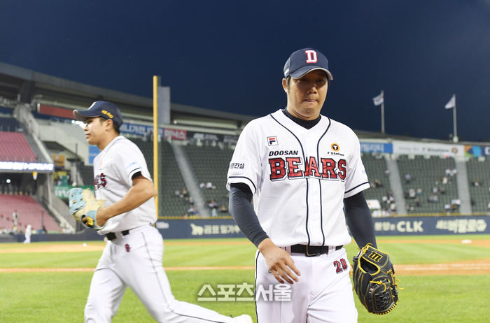 두산 베어스 선발 투수 장원준이 23일 잠실구장에서 열린 2023 KBO리그 삼성 라이온즈와 경기 5회초 수비를 마친 뒤 덕아웃으로 들어가고 있다. 장원준은 5이닝 동안 7피안타 4실점(4자책) 4삼진을 기록하며 승리 요건을 갖추고 마운드에서 내려갔다. 2023. 5. 23.