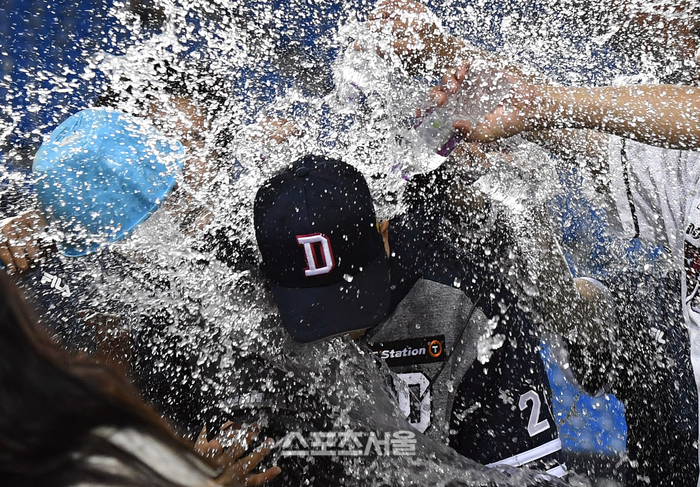 두산 베어스 장원준(가운데)이 23일 잠실구장에서 열린 2023 KBO리그 삼성 라이온즈와 경기에 선발 등판해 통산 130승을 거둔 뒤 인터뷰를 마치자 동료들이 물을 뿌리며 축하하고 있다. 장원준은 5이닝 4실점을 기록하며 2018년 이후 5년 만에 승리를 거둬 통산 130승 고지에 올랐다. 2023. 5. 23.