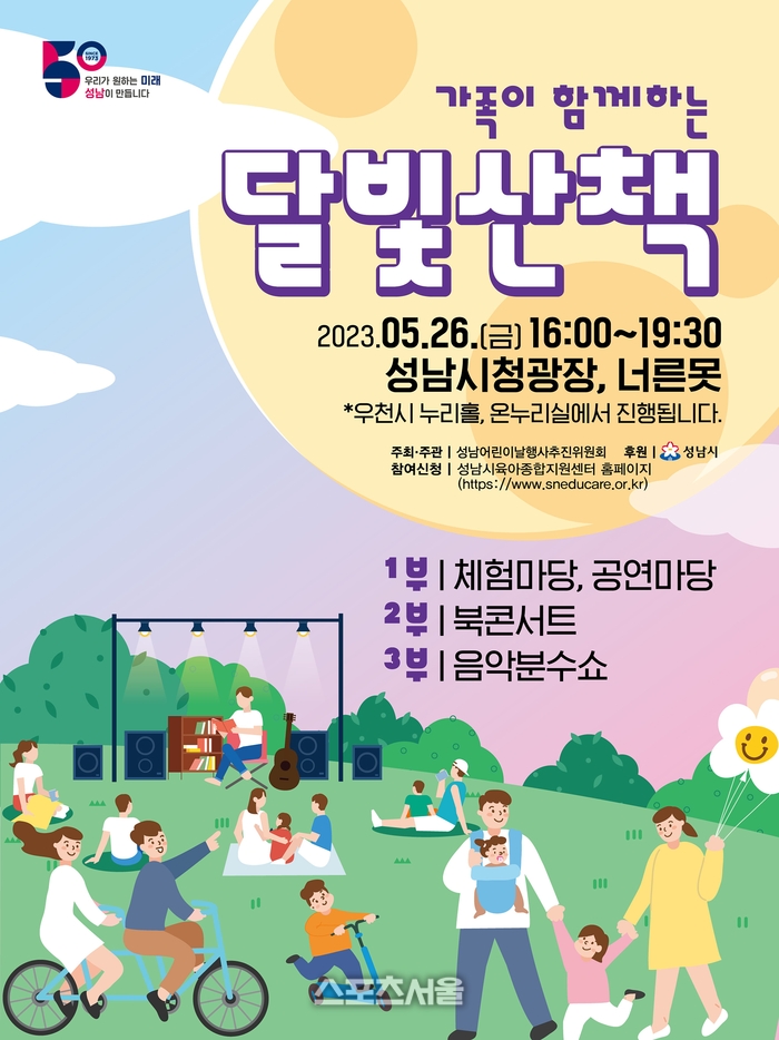 〔스포츠서울│성남=좌승훈기자〕경기 성남시는 26일 오아동보육과-성남시 26일 ‘가족이 함께하는 달빛 산책’ 행사 개최 안내 포스터후 4시부터 7시 30분까지 시청 곳곳에서 우천으로 취소됐던 어린이날 대체 행사인 ‘가족이 함께하는 달빛 산책’ 행사를 연다.