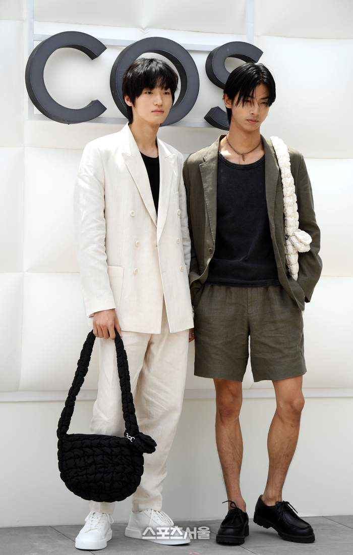 모델 이승찬(왼쪽), 유고가 24일 서울 종로구 루프스테이션 익선에서 열린 코스(COS) 퀼티드 백 팝업스토어 오픈 기념 포토월 행사에서 포즈를 취하고 있다. 2023. 5. 24. 최승섭기자 thunder@sportsseoul.com