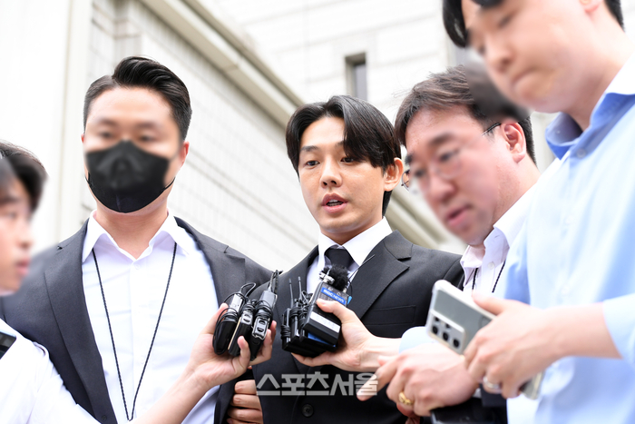 이날 현장에는 이른 아침부터 수많은 취재진이 몰렸다. 10시 30분경 검은색 정장을 입고 변호사와 함께 모습을 드러낸 유아인은 고개를 떨군 채 담담하고 차분한 표정으로 빠르게 발걸음을 옮겼다.
