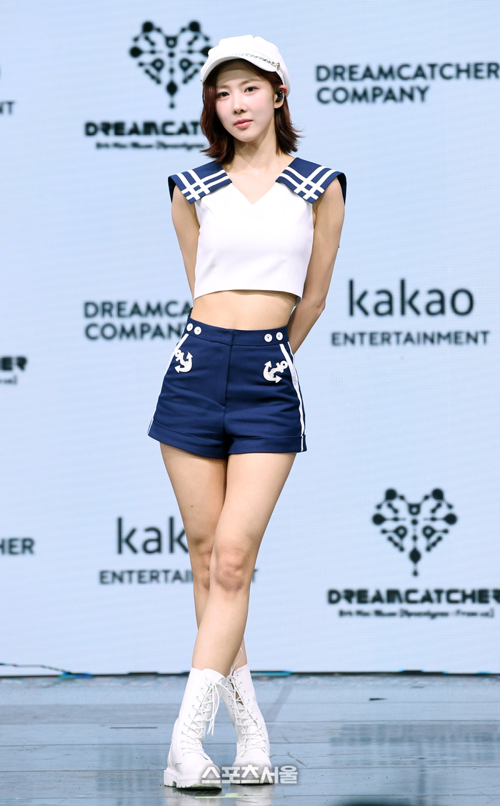 드림캐쳐 유현이 24일 서울 광진구 건국대학교 새천년관에서 진행된 미니 8집 앨범 ‘아포칼립스 : 프롬 어스(Apocalypse : From us)’ 발매 기념 쇼케이스에서 취재진을 향해 포즈를 취하고 있다.