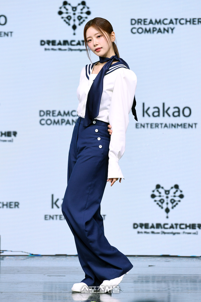 드림캐쳐 지유가 24일 서울 광진구 건국대학교 새천년관에서 진행된 미니 8집 앨범 ‘아포칼립스 : 프롬 어스(Apocalypse : From us)’ 발매 기념 쇼케이스에서 취재진을 향해 포즈를 취하고 있다.