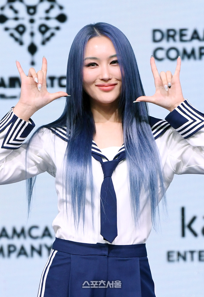 드림캐쳐 시연이 24일 서울 광진구 건국대학교 새천년관에서 진행된 미니 8집 앨범 ‘아포칼립스 : 프롬 어스(Apocalypse : From us)’ 발매 기념 쇼케이스에서 취재진을 향해 포즈를 취하고 있다.