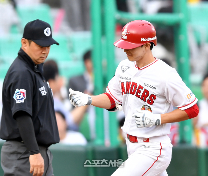 SSG 6번타자 박성한이 24일 인천SSG랜더스필드에서 열린 2023 프로야구 SSG랜더스와 LG트윈스의 경기 1회말 2사 만루에서 LG 선발투수 이지강을 상대로 우월 만루홈런을 터트린 후 홈인하고 있다. 데뷔전을 치르는 엘리아스의 어깨를 가볍게 해주는 초번 그랜드슬램이다. 2023.05.24.