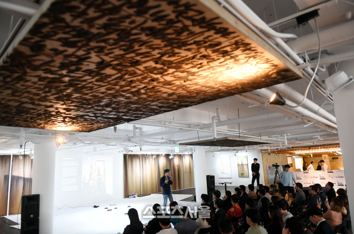 현대미술 김종구 작가가 24일 서울 남산 더 케이팝타워에서 열린 ‘퍼플 큐브 2023 인비테이션’에서 작품설명을 하고 있다. 천장에 걸린 작품도 김작가의 작품이다. ‘쇳가루로 풍경을 그리는 작가’로 잘 알려진 김 작가는 서울대 조소과, 동 대학원 조각과, 영국 첼시 칼리지 아트&디자인과를 졸업하고 활발하게 작품활동을 펼치고 있으며 1990년 대한민국 미술대전 대상, 2002년 김세중 청년조각상 등을 수상한 중견작가다. 2023. 5. 24. 최승섭기자 thunder@sportsseoul.com