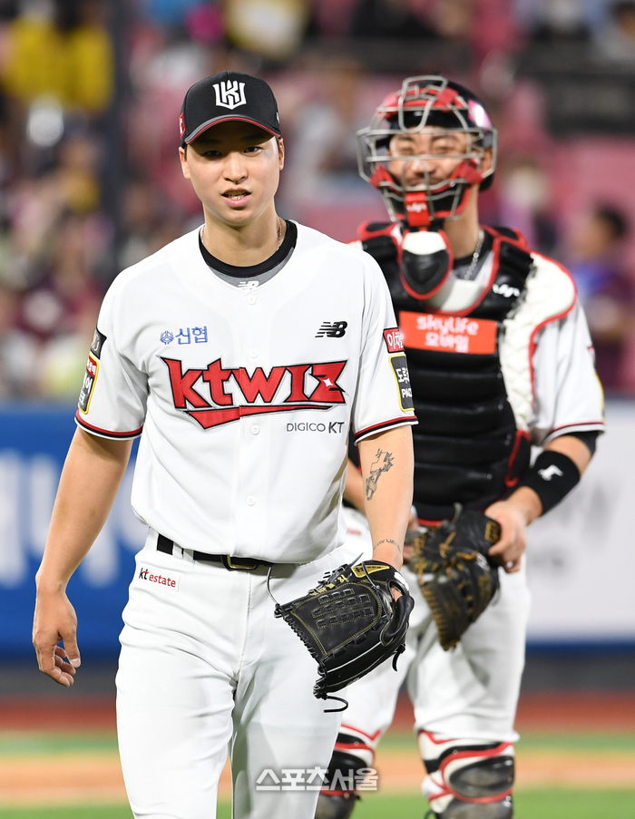 KT 위즈 엄상백이 25일 수원 KT위즈파크에서 열린 2023 KBO리그 키움 히어로즈와 경기 7회초 무사 1-2루 상황에서 마운드에서 내려가고 있다. 엄상백은 6이닝 무실점으로 승리투수 요건을 갖췄다. 2023. 5. 25.