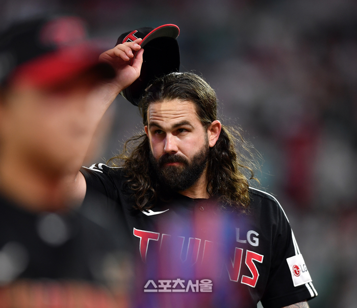 LG 선발투수 켈리가 25일 인천SSG랜더스필드에서 열린 2023 프로야구 SSG랜더스와 LG트윈스의 경기에서 6회말 수비를 마치고 더그아웃으로 들어오고 있다. 켈리는 6이닝 3실점으로 6-3 리드상황에서 마운드를 함덕주에게 넘겨줬다. 2023.05.25.