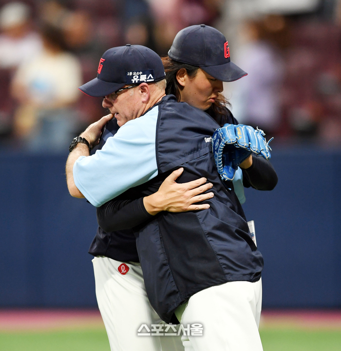롯데 투수 김원중이 26일 고척스카이돔에서 열린 2023 KBO리그 키움과 경기 승리 후 래리 서트 감독과 포옹을 하고 있다. 2023. 5. 26. 고척 | 최승섭기자 thunder@sportsseoul.com