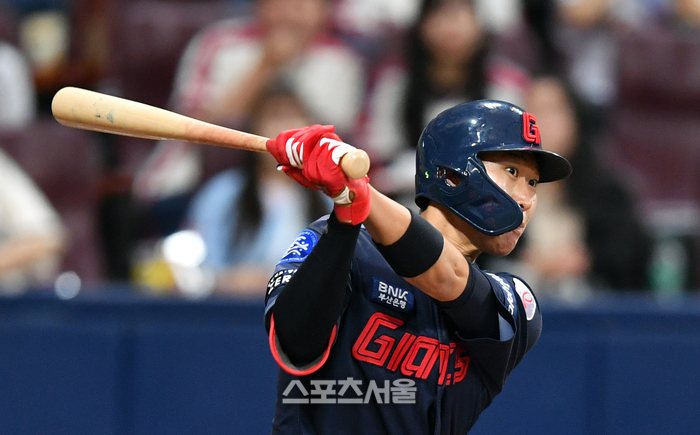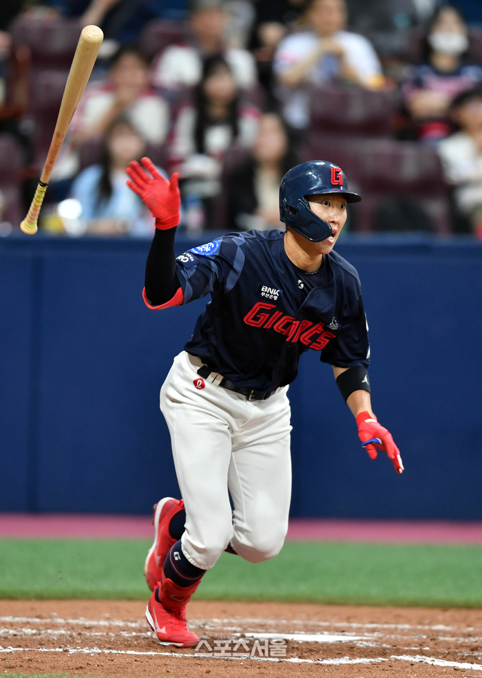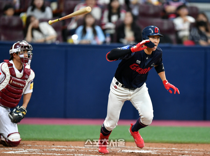 롯데 2번타자 박승욱이 27일 고척스카이돔에서 열린 2023 프로야구 키움히어로즈와 롯데자이언츠의 경기 4회초 선두타자로 나와 안타로 출루하고 있다. 2023.05.27.