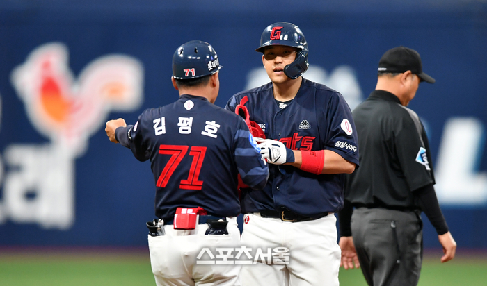 롯데 8번타자 유강남이 27일 고척스카이돔에서 열린 2023 프로야구 키움히어로즈와 롯데자이언츠의 경기 7 회초 1사 1,2루에서 1타점 2루타로 출루하며 자축하고 있다. 2023.05.27.