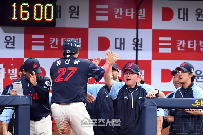 롯데 서튼 감독이 27일 고척스카이돔에서 열린 2023 프로야구 키움히어로즈와 롯데자이언츠의 경기 7 회초 1사 2,3루에서 안권수의 2타점 좌전안타로 득점한 선제타점 주인공 유강남을 환한 표정으로 맞이하고 있다. 2023.05.27.