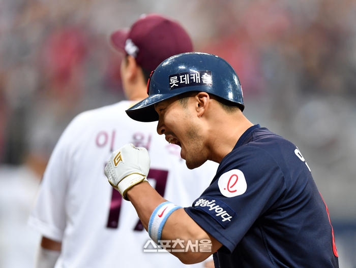 롯데 9번타자 안권수가 27일 고척스카이돔에서 열린 2023 프로야구 키움히어로즈와 롯데자이언츠의 경기 7 회초 1사 2,3루에서 2타점 좌전안타로 출루하며 환호하고 있다. 2023.05.27.