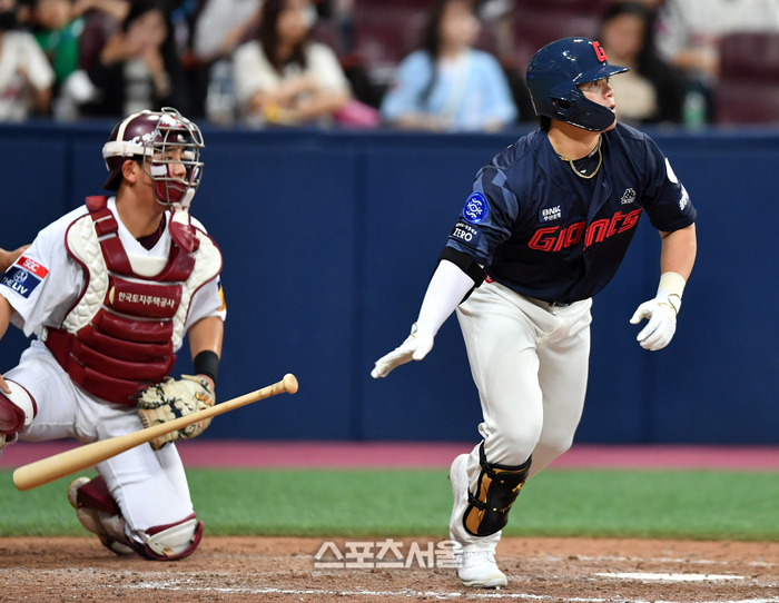 롯데 3번타자 대타로 나선 국해성이 27일 고척스카이돔에서 2023 프로야구 키움히어로즈와 롯데자이언츠의 경기 9회초 1사후 안타로 출루하고 있다. 2023.05.27.
