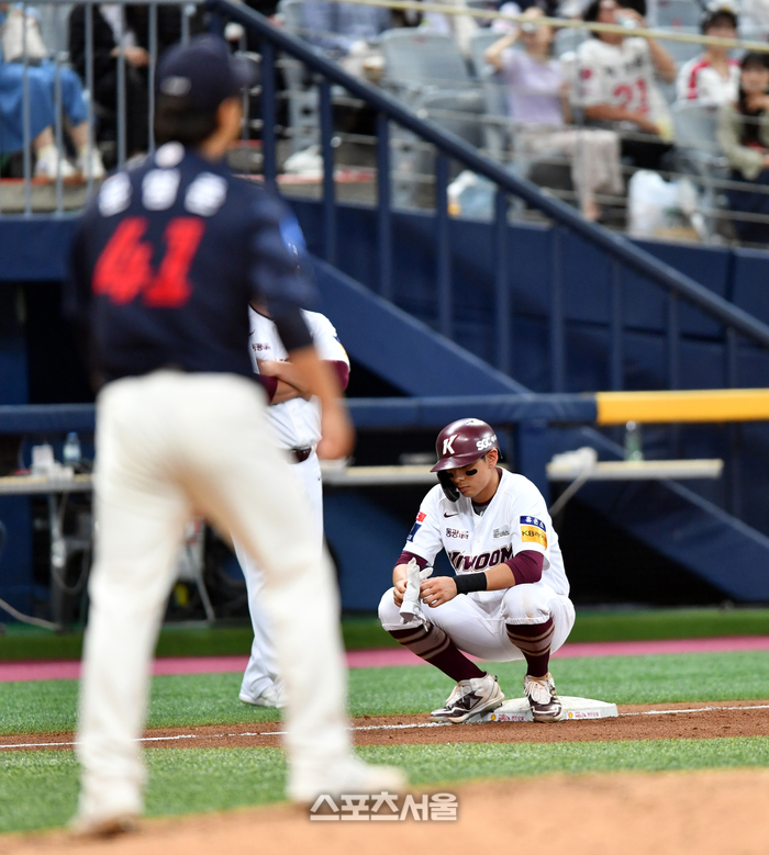 키움 3번타자 이정후가 27일 고척스카이돔에서 2023 프로야구 키움히어로즈와 롯데자이언츠의 경기 9회말 선두타자 안타로 출루한 후 3루까지 진루해 있다. 2023.05.27.
