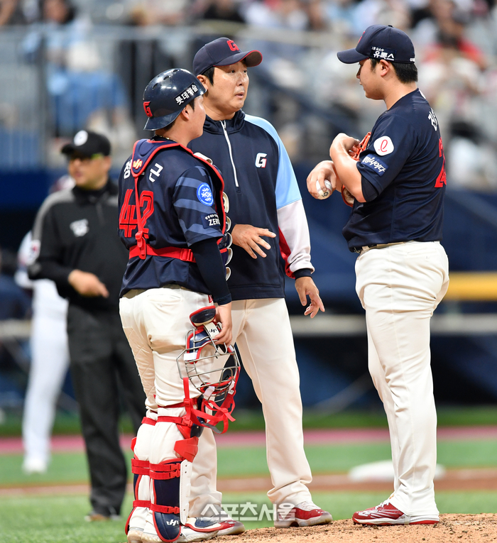 롯데 배영수 코치가 27일 고척스카이돔에서 2023 프로야구 키움히어로즈와 롯데자이언츠의 경기 9회말 투수를 다독이기위해 마운드로 나서고 있다. 2023.05.27.